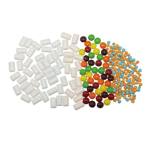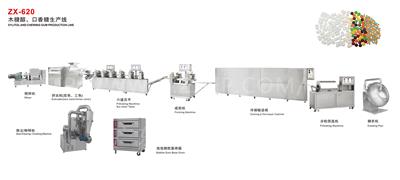 整套生產線由攪拌機、擠出機、振動輸送帶、異形糖成形機(六臺)、糖衣機(六臺)組成。